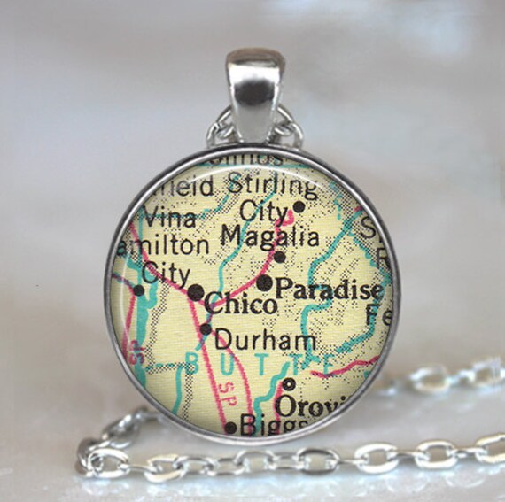 Chico, California Map Necklace, Key Chain or Map Brooch, Paradise